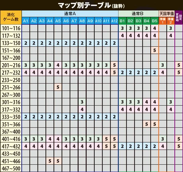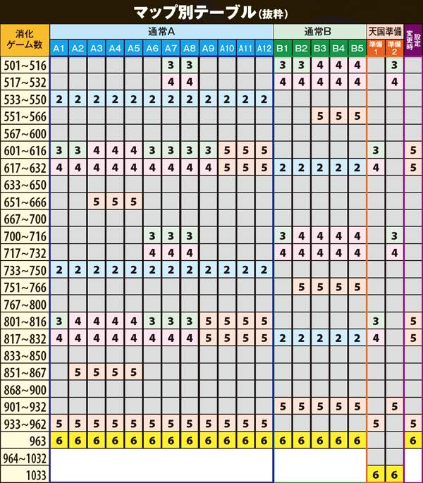 通常A滞在時は「偶数設定の方が天国準備に移行しやすく、高設定になるほど移行率アップ」、通常Bでは「単純に高設定ほど天国準備に移行しやすい」という特徴がある。つまり、天国準備への移行は高設定の根拠となる材料のひとつなので、これをきっちりと把握できれば高設定看破の強力な足掛かりとして活用できる。