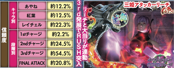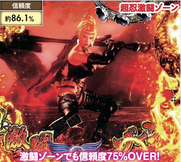 NINJA GAIDENの女性キャラがメインで活躍!! 『99type-neo-』は突入率50%、継続率75%と三姫RUSHに入れば一撃の出玉に期待できる。 |