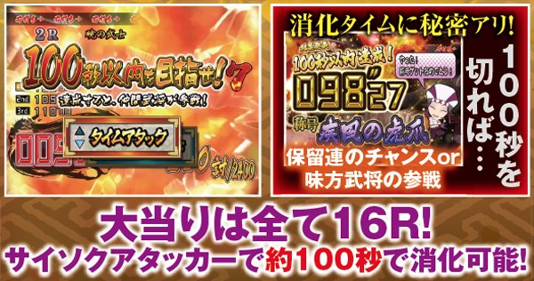 確変中(電チュー消化時)の大当りは全て約2240発を獲得可能な16Rとなる。ラウンド中のタイムアタックで100秒を切れば、上記の通り嬉しい特典も用意されているぞ。