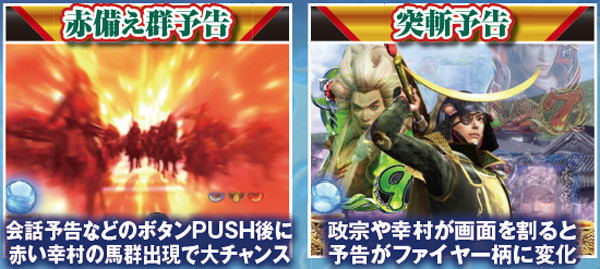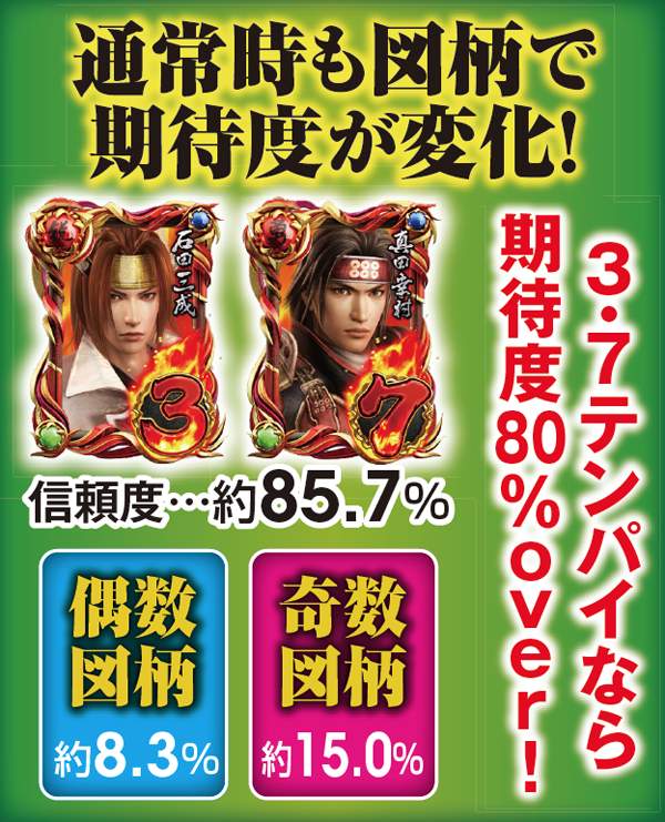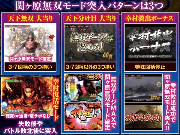 通常時は、3・7揃いなら問答無用で確変へ突入するが、それ以外の図柄揃いと特殊図柄停止はラウンド中の演出により当否が決まる。ラウンド演出失敗後やバトル敗北後に突入する「幸村復活モード」は潜確の可能性が残るため、ヤメ時には注意しよう。