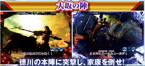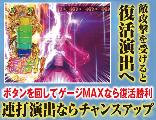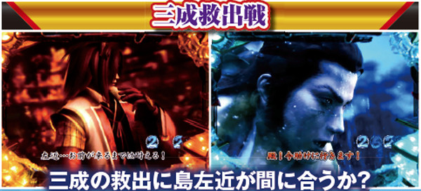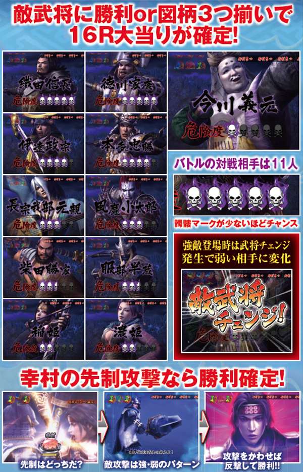 敵武将が登場すれば16R&確変継続を賭けたバトルへ。敵の危険度が低いほど勝利期待度は高く、武将チェンジが発生すれば必ず弱い相手へと変化する。幸村が先制すれば勝利となるが、敵攻撃時はピンチ。その際は反撃や復活演出に期待しよう。敗北後は非電サポ状態の幸村復活モードへ移行する。