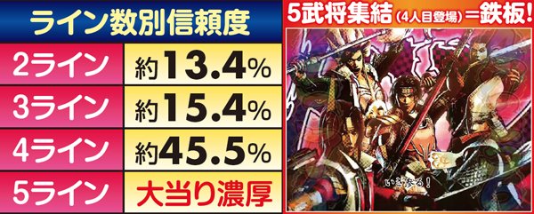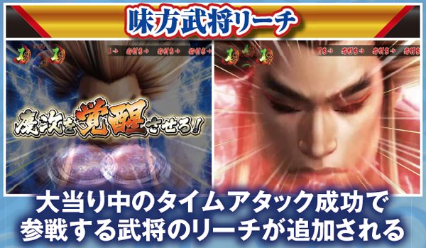 デジタル開店開始直後やリーチ後に発展。ボタンを押して味方武将が登場するたびにラインが増加。5ラインなら超激アツ!