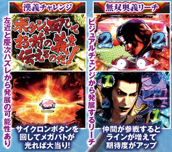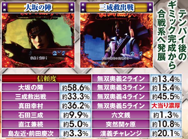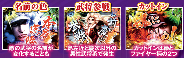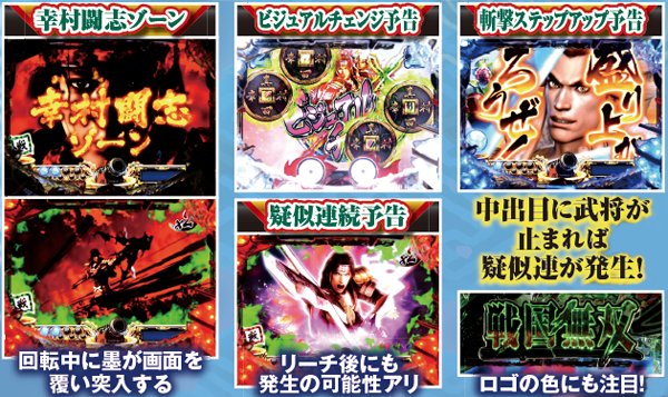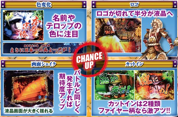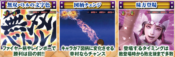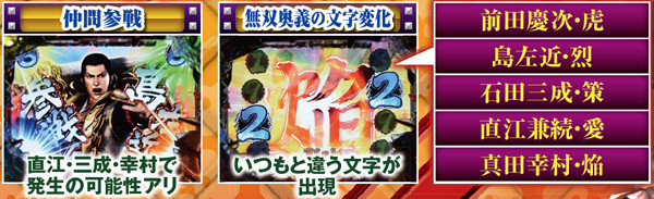 男性武将系は期待度の高い真田幸村へ発展するためにも「無双チェンジ」の発生がカギとなる。また、弱リーチの島左近や前田慶次は、ハズレ後に「漢気チャレンジ」へと発展すればチャンス。