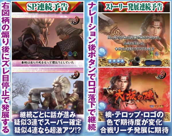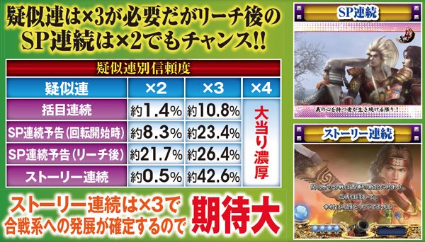 SP連続はリーチ後なら「×2」でも信頼度2割超。ストーリー連続は合戦系への発展が確定する「×3」到達で激アツ!