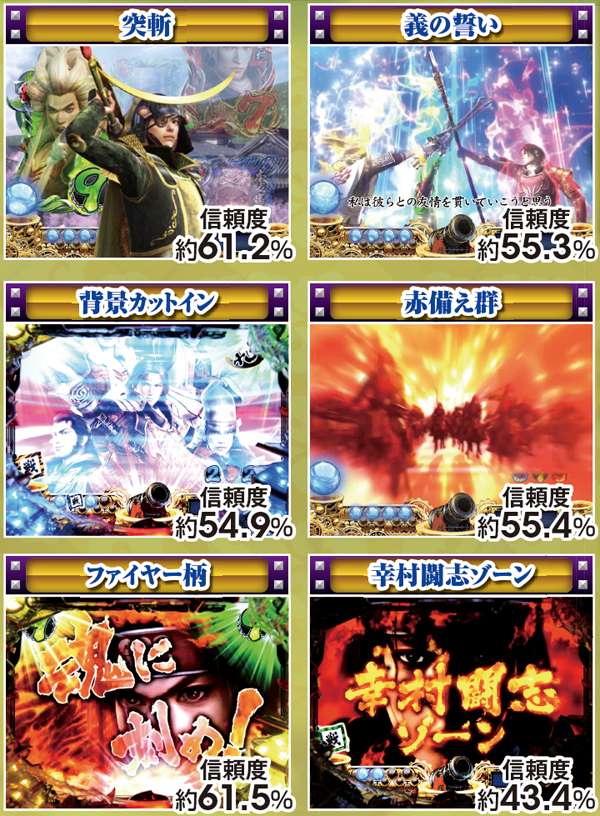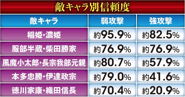 各武将によって信頼度に差が付けられており、基本は危険度の高い敵ほどピンチ。敵先制の際は、強いキャラほど強攻撃の信頼度が低くなっていくが、最強の「徳川家康・織田信長」でも7割超で勝利へと繋がる弱攻撃ならどのキャラでもチャンス。