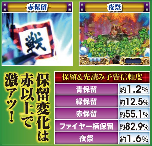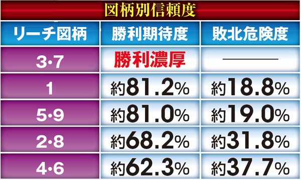 テンパイ図柄によっても期待度は激変する。信頼度6割前後の青図柄に比べ、緑図柄では8割超にアップ。赤図柄は勝利濃厚だ!