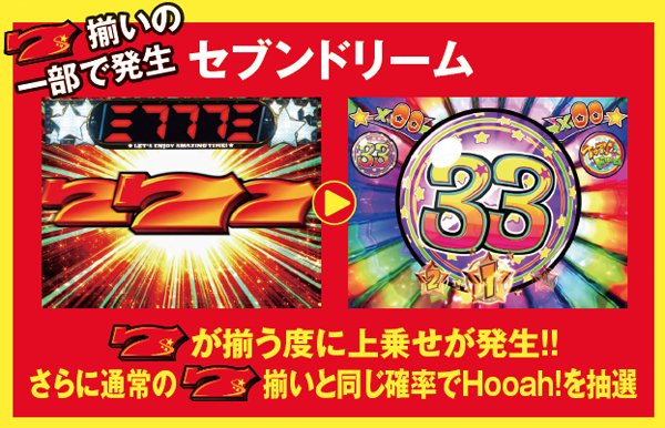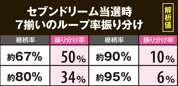 継続抽選に漏れるまで7が揃いまくるセブンドリーム。最低でも約67%、最高で約95%とかなりの優良な値で、かつ7が2回揃うまで終了することはない。