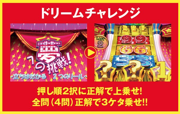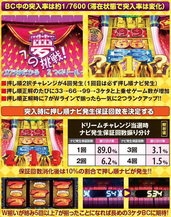ドリームチャレンジは当選時にまず「押し順ナビを何回発生させるか」が決定される。大半は1回が選ばれるが、2~4回が選ばれた場合は激アツで、3ケタBC獲得への期待がグッと高まる。また、W揃いが絡んで5回以上7が揃った勘定になれば、長めの3ケタBCにも期待できる。