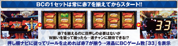 強弱のチャンス目をメインに周期短縮抽選が行われるので、チャンス目の停止型は要暗記。ちなみに、短縮抽選に当選した場合は即周期抽選となり、数ゲームの前兆を経てBCの当否が液晶で告知される。チャンス目後は数ゲーム様子を見よう。