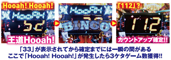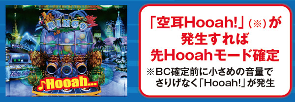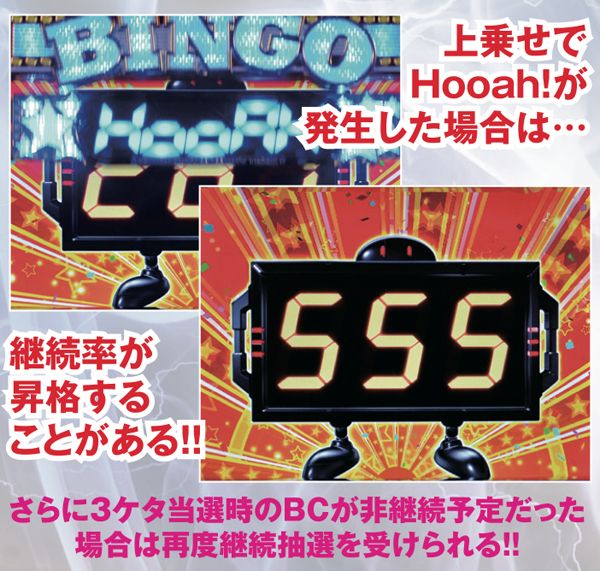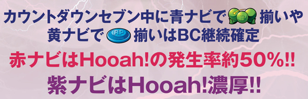 BC中の上乗せでHooah!が発生した場合は、3ケタ上乗せは当然のこと、BC継続率アップや継続抽選そのものを受けられる特典もある。発生後はカーニバルへの移行に期待しよう。