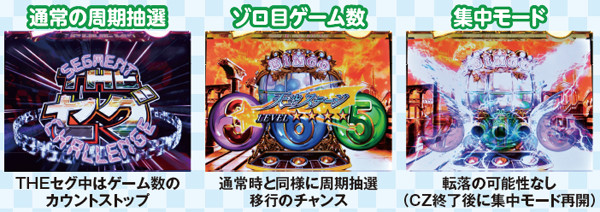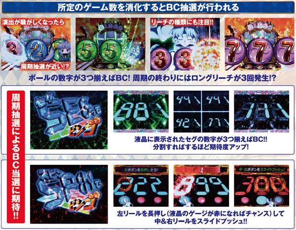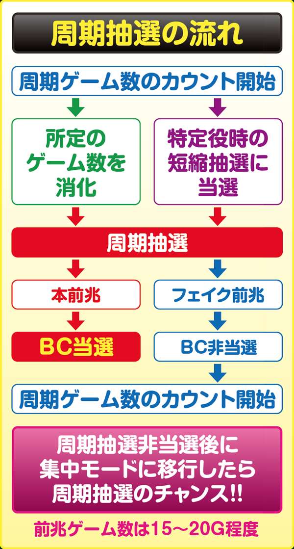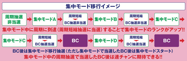周期抽選でBC非当選後は必ず集中モードに突入。実戦でも周期終了と思われるゲームからほどなくして再び周期抽選が行われるパターンを確認できたので、周期後の即ヤメは厳禁。数ゲームは様子を見たほうがよさそうだ。なお、集中モードで当選したBC後は再度、集中モードからスタートする。