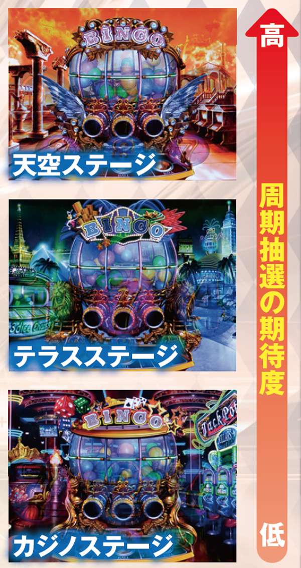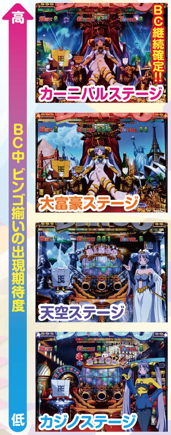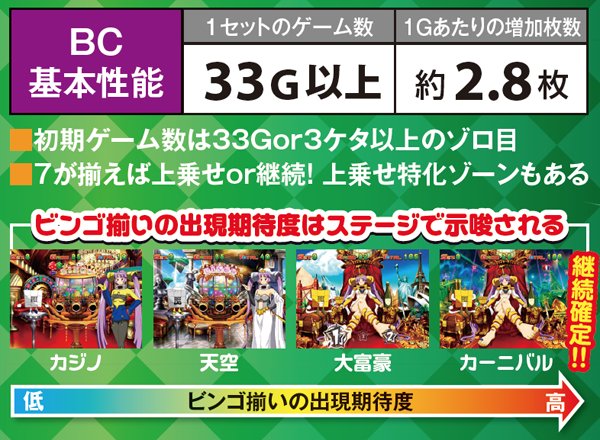 BC終了画面の法則について、「大富豪」や「天空」などの上位ステージの選択率が高ければ高設定に期待が持てる。終了画面は青空・カジノ・天空・大富豪・レインボーの5種類で、このうちレインボーは復活継続が確定するので、最も期待できるのは大富豪だろう。