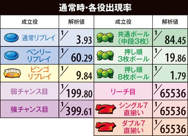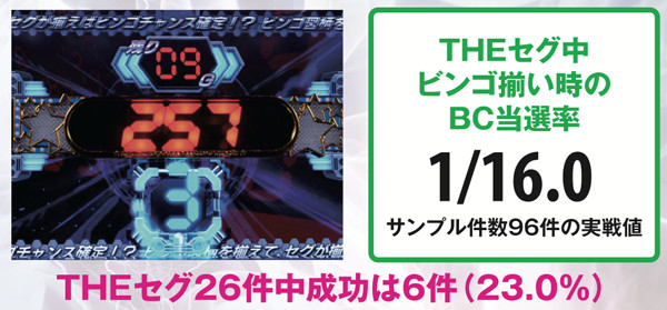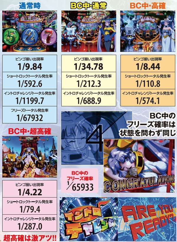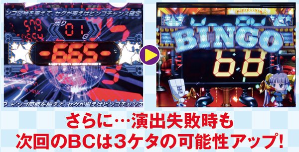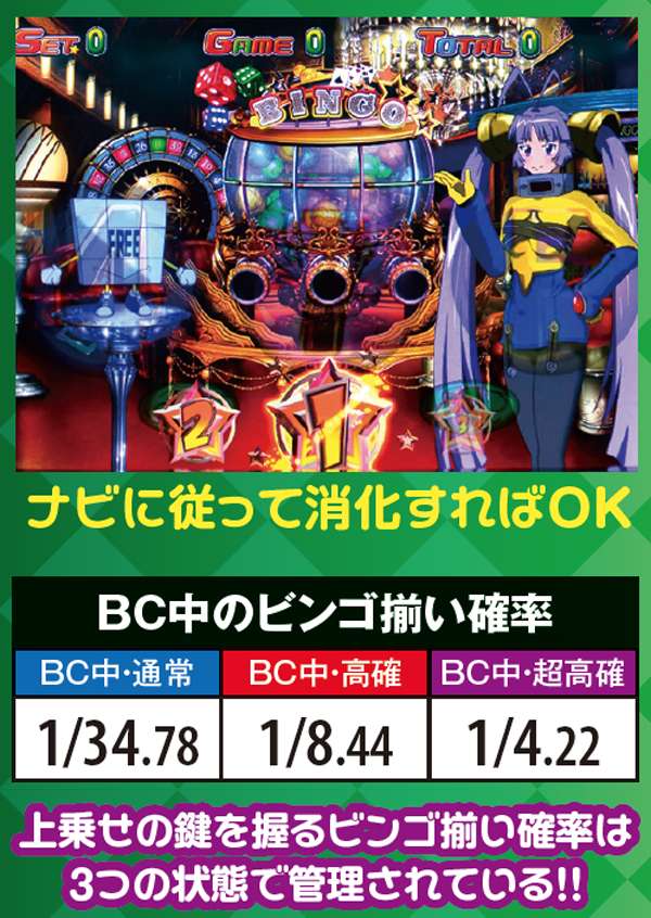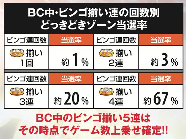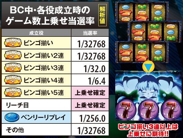 BC中のビンゴ揃いは上乗せのチャンスだが、重要なのはどれだけ連続して揃ったか。単発や2連なら上乗せ当選率は32768分の1と期待薄だが、3連目以降は一気に現実味のある数値となる。超高確の重要性が分かるというものだ。