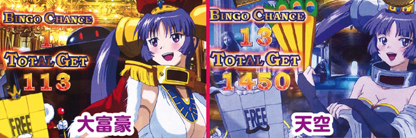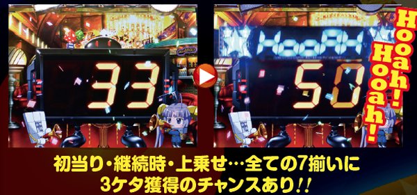 「ふぅあ! ふぅあ!」の声から始まるカウントアップ再び…。 1セット33G、1Gあたり約2.8枚増のAT・ビンゴチャンス(BC)は、周期抽選とシリーズ初となる自力高確率ゾーンで抽選される。BCが残り7Gになるとお馴染みのカウントダウンセブンが発生し、BGM停止でBC継続となる点はシリーズ通して不変のパターンである。 ビンゴ絵柄揃い時に抽選されるゲーム数の上乗せ、さらには上乗せ特化ゾーンなども搭載! |