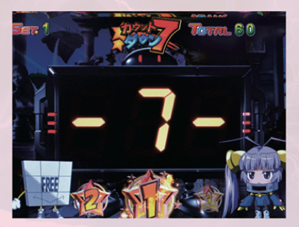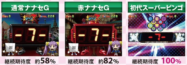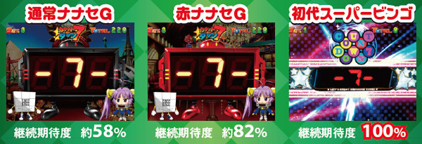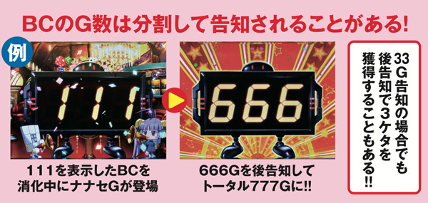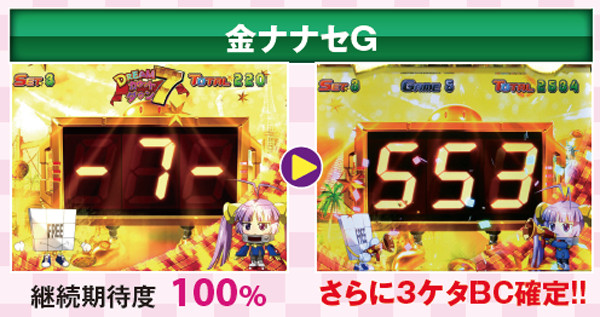 BCが残り7Gになると突入するカウントダウンセブンでは、まずナナセGの色に注目。赤なら約82%で継続、金なら継続確定の上、3ケタ獲得まで約束されるので頭の中まで金ぴかになってしまう可能性大だ。