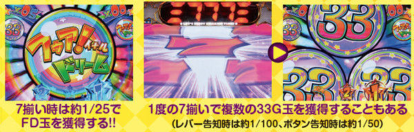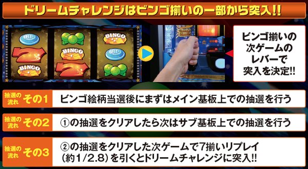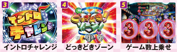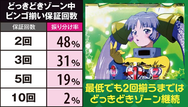 どっきどきゾーンはビンゴ揃いのたびに上乗せ抽選を受けられる特化ゾーンで、ロング継続させれば複数回の7揃いにも期待できる。突入時にビンゴ揃いの最低保証回数が決まるシステムで、どんなに少なくても2回ビンゴが揃うまでは継続。保証回数分揃ったあとは押し順ボール時の転落抽選にもれるまで続く仕組みだ。