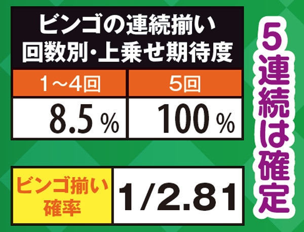 ビンゴ揃いのたびに8.5%の割合で上乗せに期待できるので、5回保証や10回保証の場合は相当上乗せに期待が持てる。