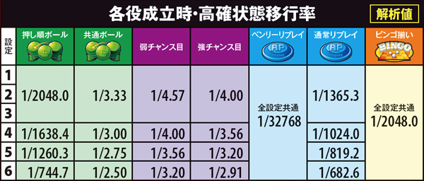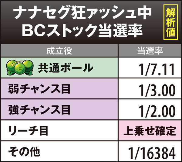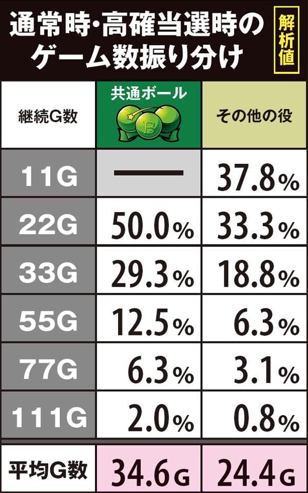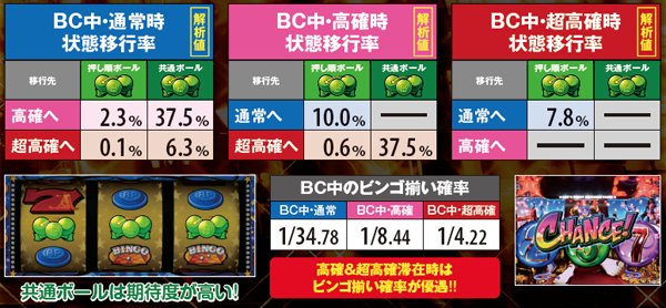 アツいのは共通ボールで、通常からなら43.8%で、高確からなら37.5%で状態昇格に期待できる。BC中の滞在状態は液晶ステージで示唆されるので、共通ボール後に上位ステージに移行すれば高確のチャンスだ。