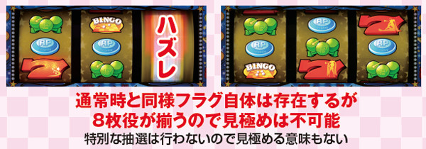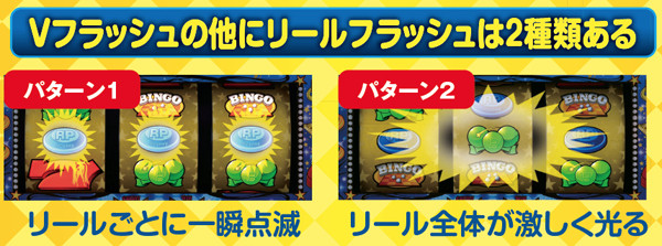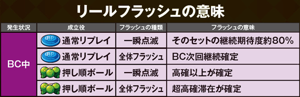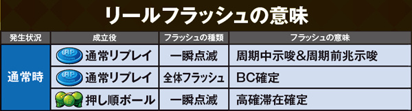リプレイ時に各リールが一瞬光れば周期が近い可能性が高く、激しいフラッシュならBC確定。チャンス目時のフラッシュは短縮確定だ。