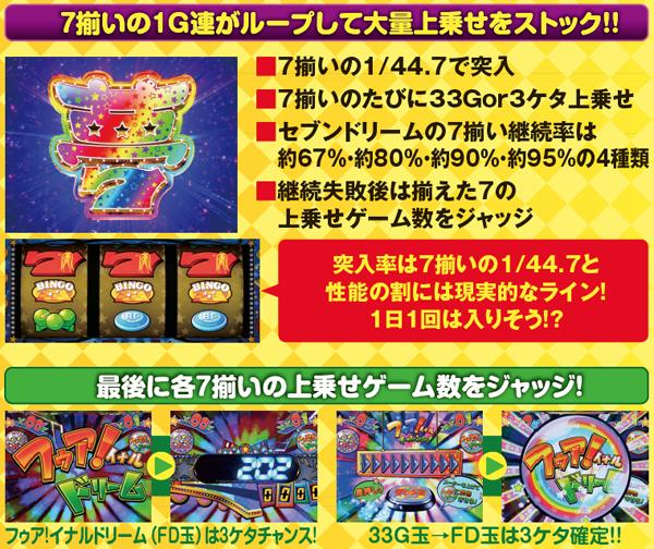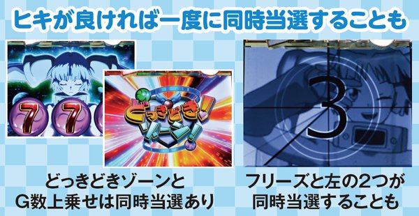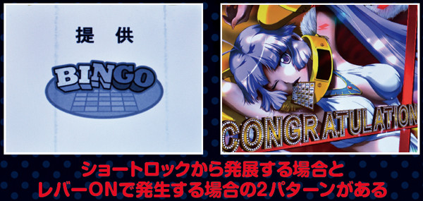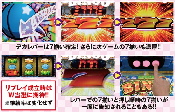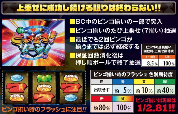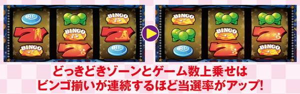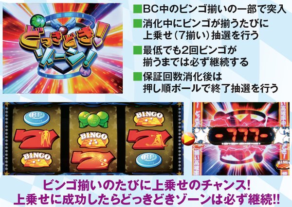 上乗せしている限り連チャンするどっきどきゾーン中は、ビンゴ絵柄が揃うたび8.5%の割合で7揃いのチャンス(5連続時は確定)。ビンゴ揃い時のフラッシュで期待度を示唆しているので要注目だ。
