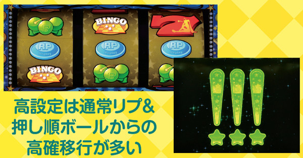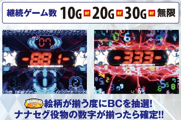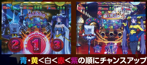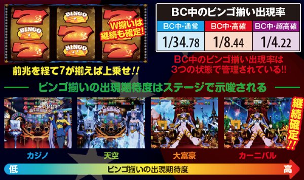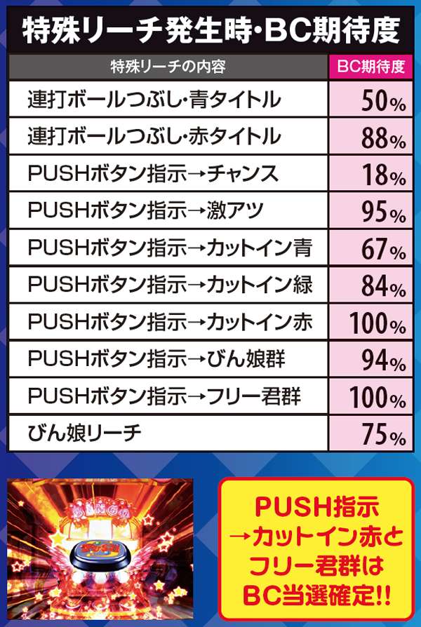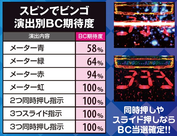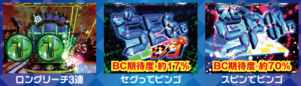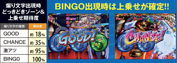 BC中に前兆演出として「GOOD」や「CHANCE」の文字が出ることがあるが、「激アツ」なら期待度約95%とほぼ本前兆はもらったようなもの。「BINGO」ならBC上乗せが確定する。