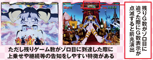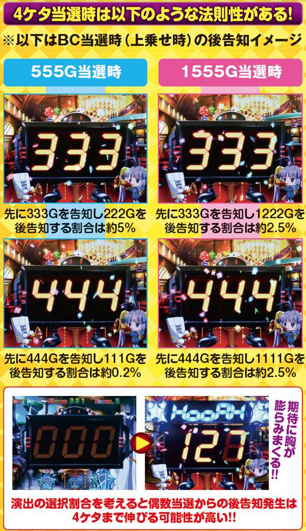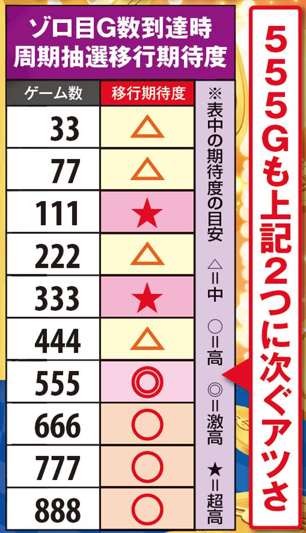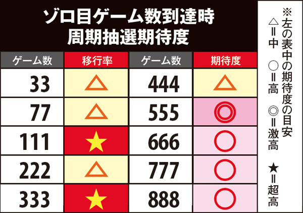 ゾロ目ゲーム数到達時は周期抽選が行われるチャンスであるが、中でも111Gと333Gが特にアツく、次いで555Gの期待度が高い。天井振り分けのある444Gとともに狙い目となるので必ず覚えておきたい。
