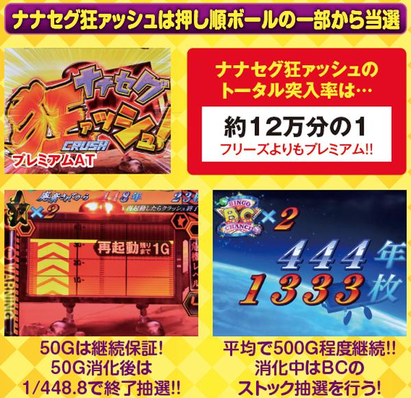 ナナセグ狂ァッシュの突入率は約12万分の1とかなり低いが、突入時はそれ相応の見返りが期待できる。終了抽選は1/448と低めの確率なので、ヒキ次第では500Gはおろか1000G継続もありえる。