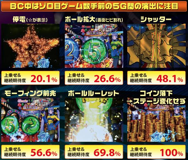 BCのトータル継続ゲーム数がゾロ目に到達する際は、5Gから前兆演出が発生することがある。停電やボール拡大なら20%程度の期待度だが、それ以外の演出なら上乗せやBC継続のチャンスとなるので、期待しつつ演出を見守ろう。