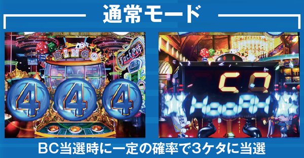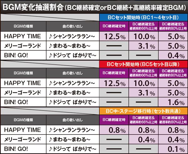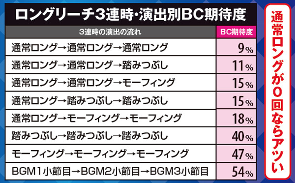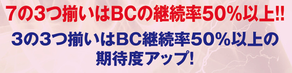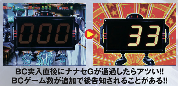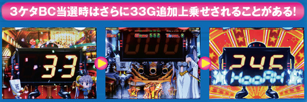 3ケタBC獲得時は大量ゲーム数を手にする他に2つの特典がある。第1の特典はBC継続率の昇格抽選を受けられるというもので、もう一つは現在消化中のBCが継続抽選に漏れていた場合、再度BCが継続するかどうかの抽選を受けられるというもの。3ケタ獲得後のBGM変化などは後者の抽選に受かった可能性が高いだろう。