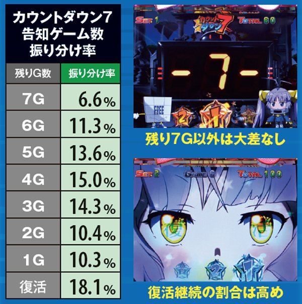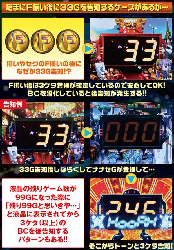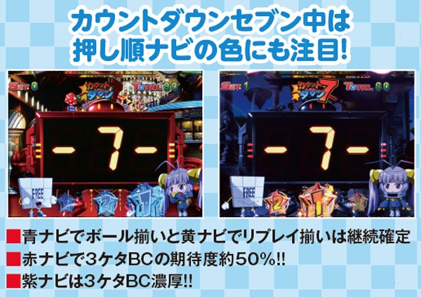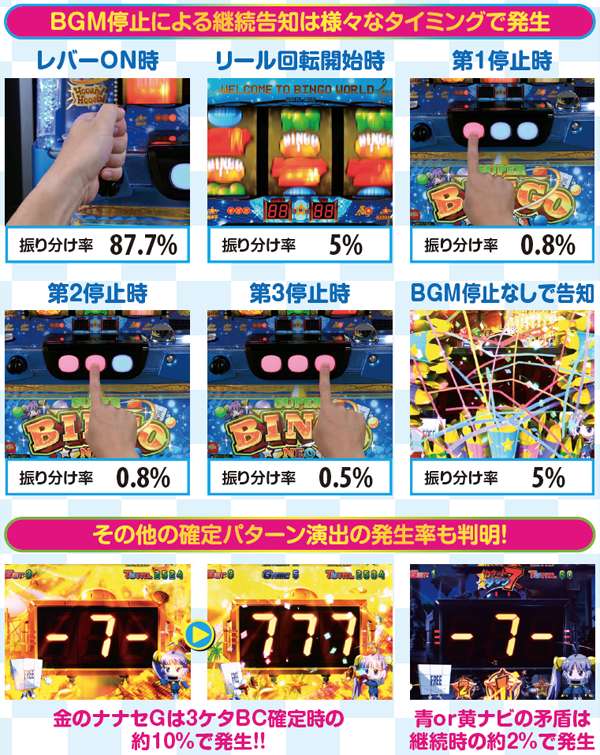 「カウントダウンセブン」はレバーON時にBGMが停止すればBC継続確定となるが、稀にレバーON以外のタイミングでBGMが止まり、驚くことがある。マニアックなのは「リール回転開始時」の告知で、この場合はレバーONからウェイトが切れた瞬間の告知となる。