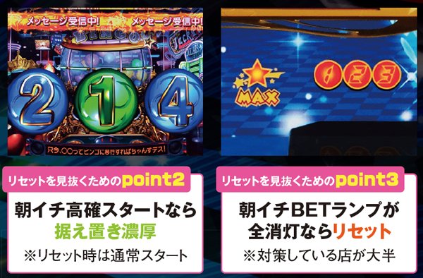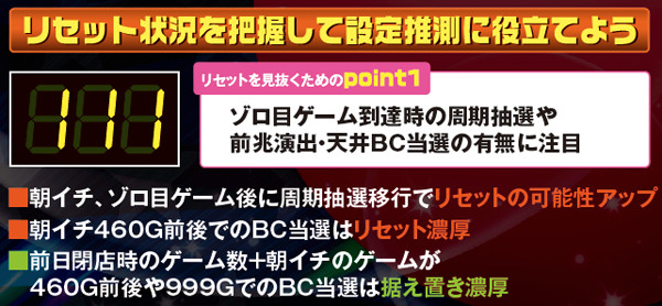 朝イチの挙動で特に注目したいのはモードBの天井(444G+前兆)で、そこでのBC当選はリセットが濃厚に。宵越し天井発動なら据え置きが濃厚になる。