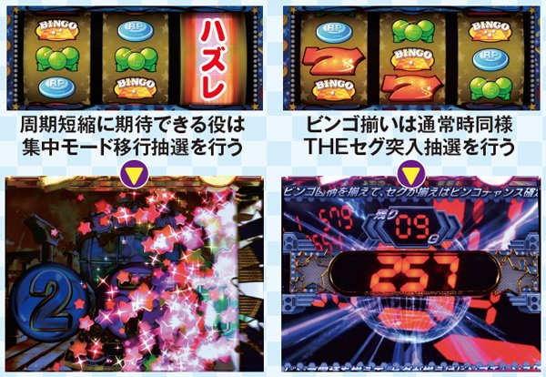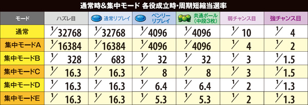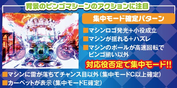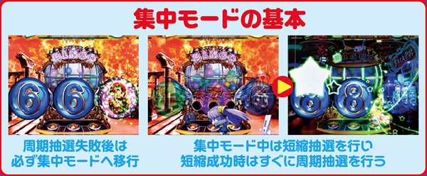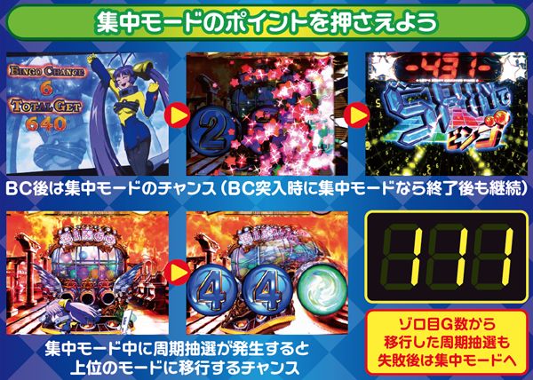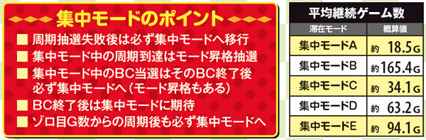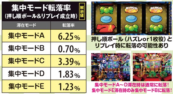 集中モードは押し順ボール(ハズレ出目や1枚役)とリプレイ時に転落の可能性があり、モードBやEは100G以上のロング継続となることも十分あり得る。特にモードEは転落先がモードBとなっているので、トータルで数百ゲーム集中モードが続くことも珍しくない。