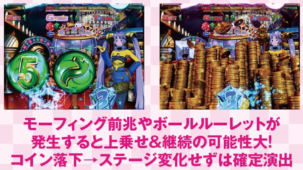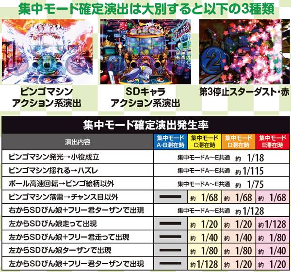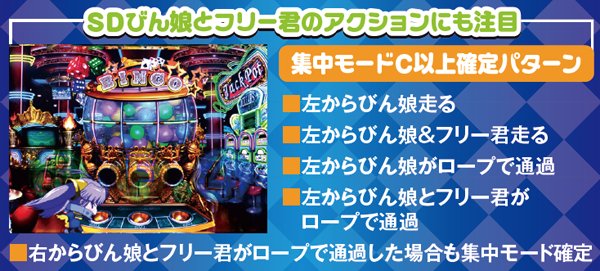数ある演出の中でも特に重要なのがこの集中モード確定演出で、特にSDキャラは集中モードC以上が確定するパターンが多いので見落とし厳禁。基本的にキャラが左からくるとアツいという法則は覚えておこう。ビンゴマシーン演出は対応役が決まっているので、こちらも要暗記だ。