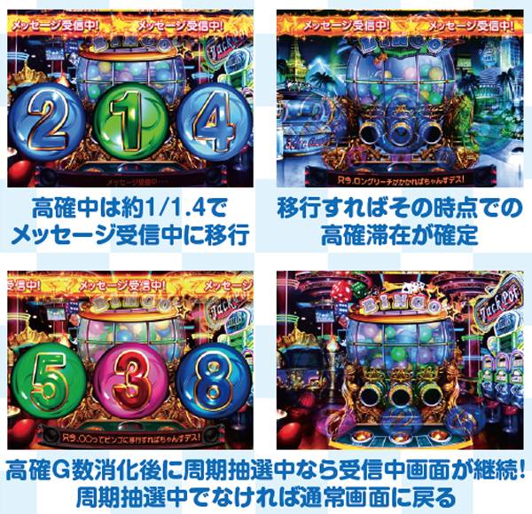 高確中は大半が「メッセージ受信中」となるので、その際の周期抽選移行に注目。受信中に周期抽選へと移行した際は、高確が終わっても受信中画面から移行せずにそのままロングリーチ3連などが発生するので、サンプルの見極めは容易だ。なおロングリーチ2連止まりは周期抽選ではないので注意。