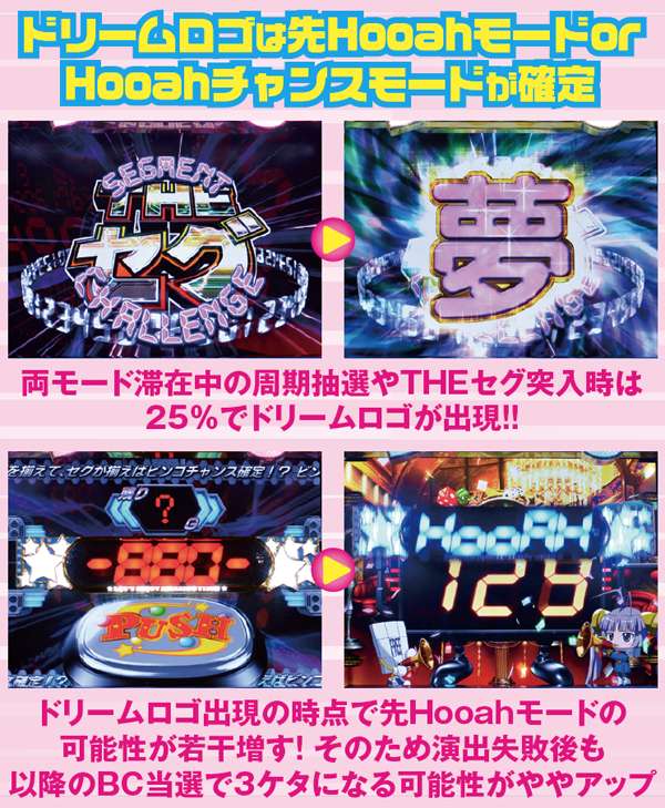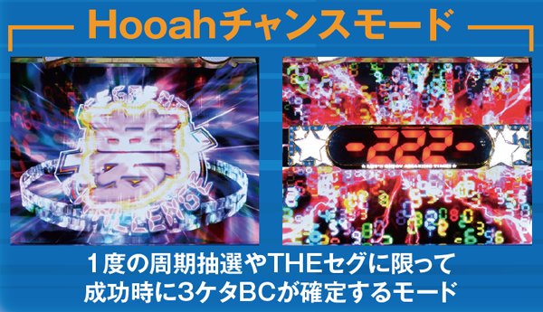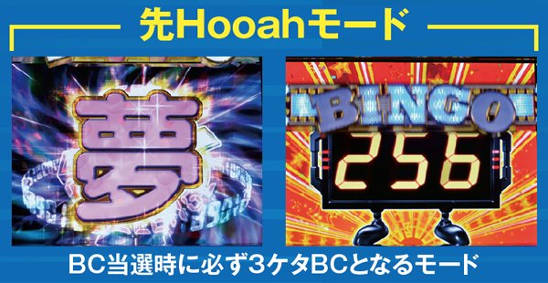 3ケタBCが確定する先HooahモードとHooahチャンスモードの唯一にして最大の違いは「BC抽選失敗後にモード移行するか否か」。前者は抽選に失敗しても同じモードに留まり続けるため、滞在示唆演出であるドリームロゴの出現には要注目である。