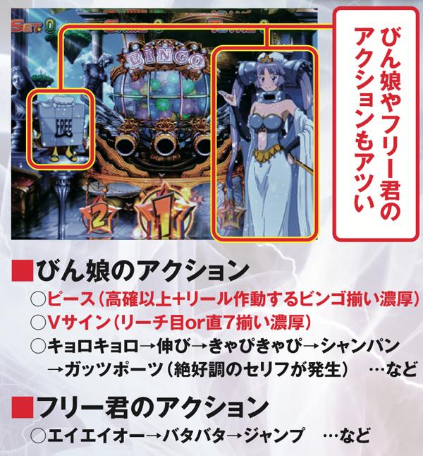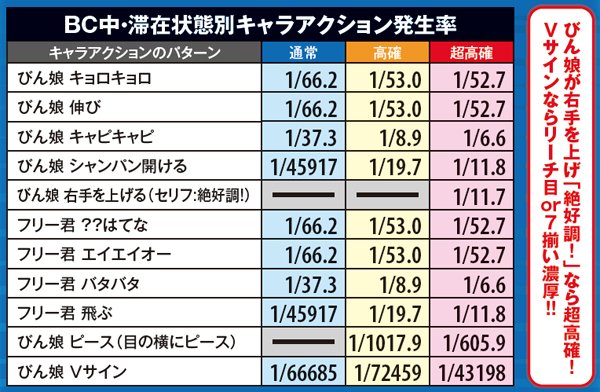 ビンゴ揃い確率に影響を与えるBC中の「状態」は主にステージから判断可能だが、びん娘やフリー君の動きにも注目。びん娘のピースとVサインは似ているので位置までチェックしよう。