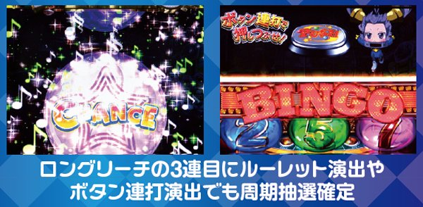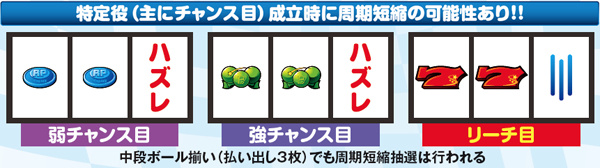 演出が騒がしくなった場合は周期抽選が近いことを示唆しており、リーチの連続発生時などは席を離れないようにしたい。ちなみに、特定役成立時は周期抽選の短縮抽選を行っており、抽選をクリアした場合は周期抽選までのゲーム数を短縮して即抽選を行うといった特徴があるのでチャンス役後は注目したい。