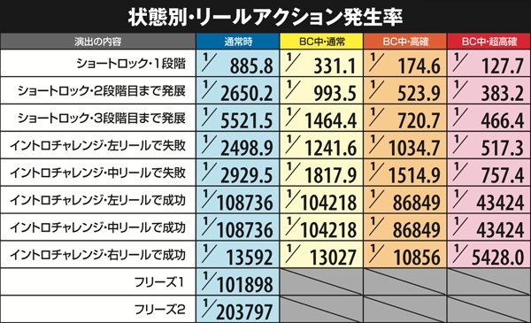 ロングフリーズはショートロックから発展する場合とレバーONで発生する場合があるが、性能はどちらも同じ。333G以上のBCが確定するので、セグのゲーム数がどこまで伸びるか見守ろう。