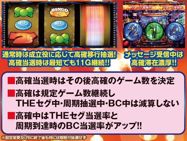高確移行に期待できるのは主に共通ボール(中段ボール揃い)・弱チャンス目・強チャンス目の3役。高確滞在中は「メッセージ受信中」やボールのバウンド停止、停電→「!!!」といった演出が出やすいので、前述の3役成立後にそれらが出たらしばらく様子を見よう。高確滞在中はTHEセグ当選率が上がるほか、周期抽選が行われた際の期待度もアップする。