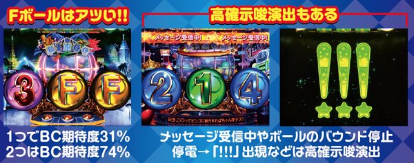 ボールの特定出目の法則を全部覚えるのはある程度の慣れが必要だが、とりあえず「1色だけならアツい」「テンパイしていればアツい」という2つの法則は覚えておきたい。またFボールは期待度が高いだけでなく、揃った場合は3ケタBCも確定するので出現後は周期抽選の結果が出るまで必ず打ち切るようにしよう。