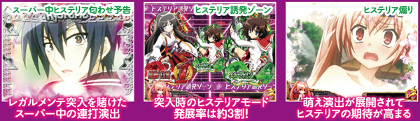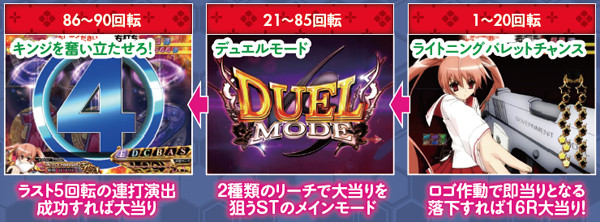 ST中は回転数ごとに演出が変化。STのメインとなるデュエルモード中は、ヒステリア、バトルの2種類のリーチが発生する。