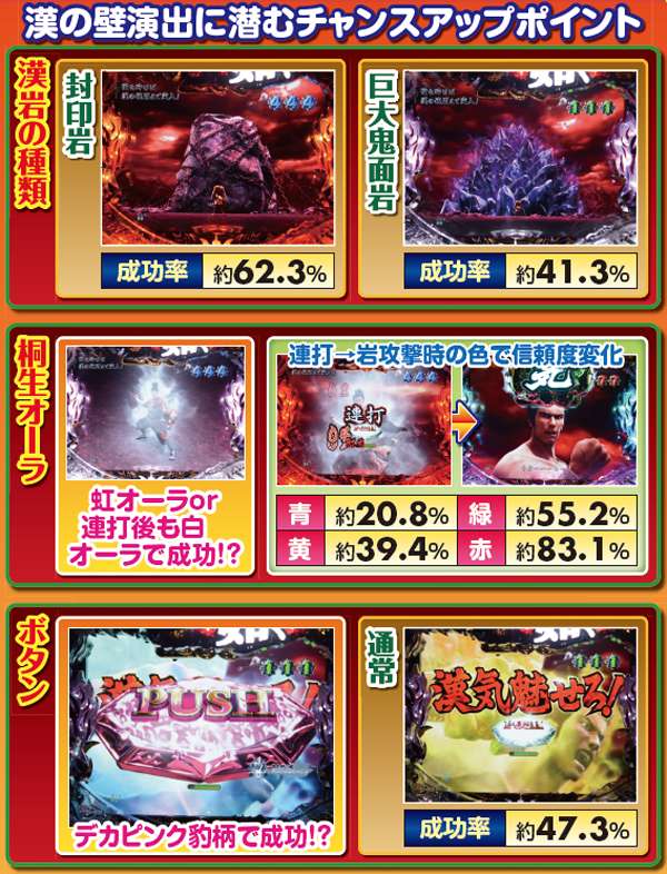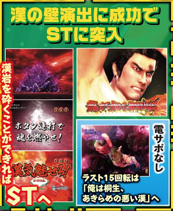 漢の壁演出で見事漢岩を破壊できればSTへ突入する。封印岩やオーラの色によって成功率が変化。STは電サポが100回転のため、最後の15回転になると電サポなしモードへ移行する。