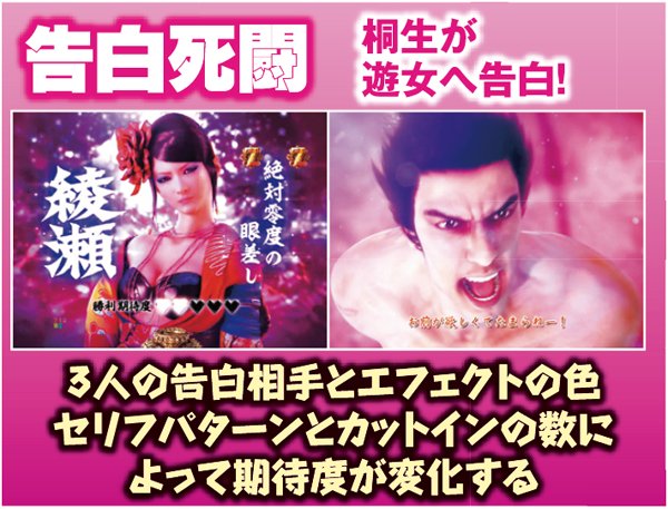 ST中は2つのバトルが展開される。敵との激しい闘い「極烈死闘」と愛を遊女に告白する「告白死闘」が楽しめるぞ。