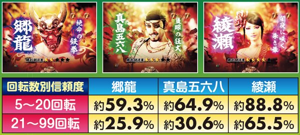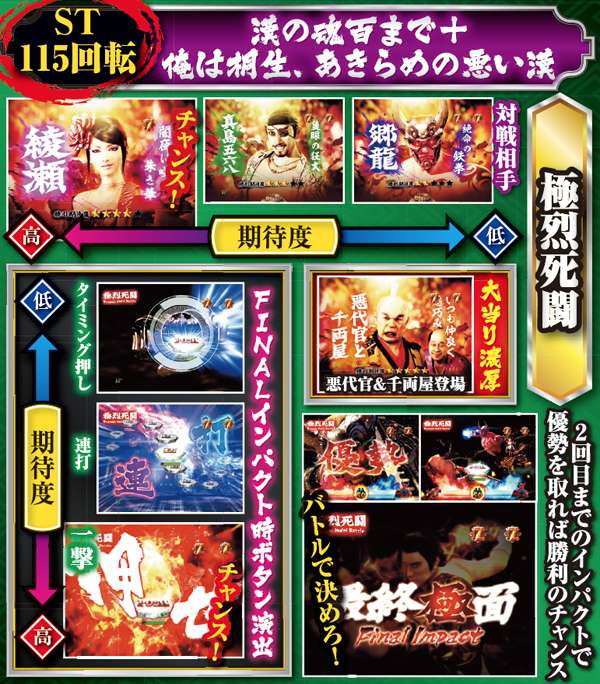 ST中の5〜99回転で発生する極烈死闘は滞在回転数で信頼度が異なる仕組み。対戦相手の☆が5つ、あるいは悪代官&千両屋が登場した場合には回転数を問わず大当り濃厚。また、3・7図柄でのテンパイも鉄板だ。