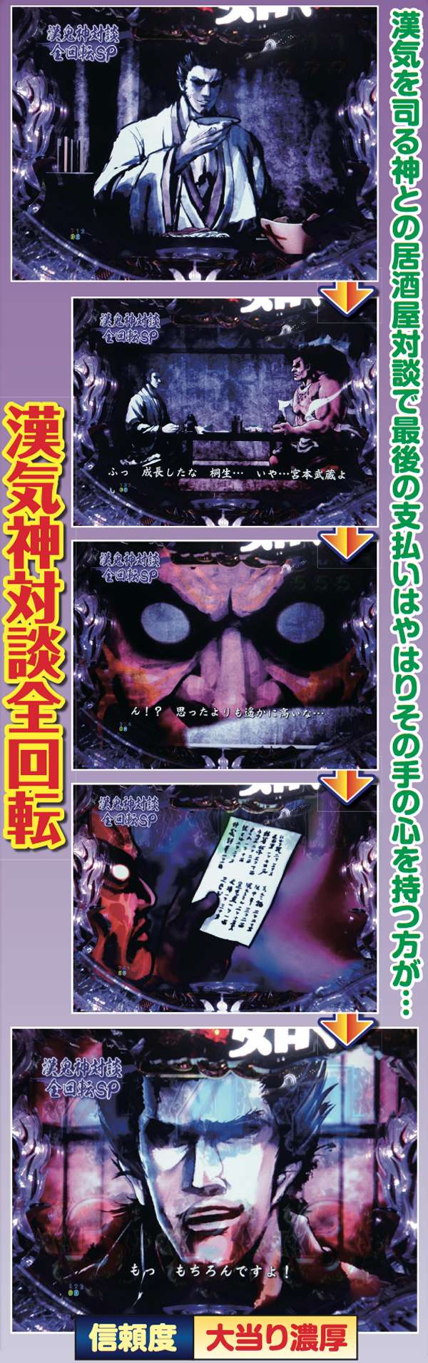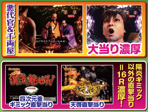 通常時の大当りに必要なのが、この5大演出となる。佐々木小次郎との対決を描いた巌流島決戦SPを始め、お馴染みの天啓予告やピンク豹柄などどれも出現しただけで期待度が大きく跳ね上がるアクションだ。
