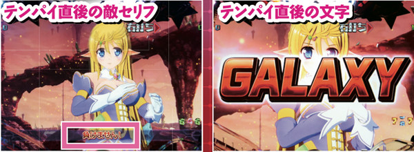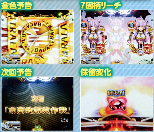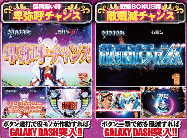 いずれのボーナスもラウンド中の演出をクリアすれば盤面右下のVアタッカーが解放し、V入賞でGALAXY DASHに突入する。この時、赤系のチャンスアップが出れば成功率は9割を超える。