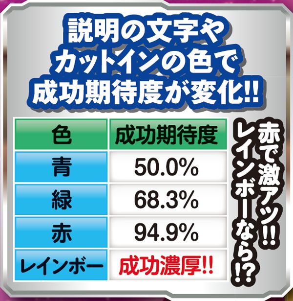 大当りラウンド中、盤面右下のVアタッカーに入賞すれば確変ゲット。その成功率を左右するのが、上記の2パターンのチャンス演出。文字やカットインが赤色なら確変の期待大。