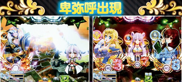 中出目に卑弥呼の7図柄が止まれば保留先読みの連続予告へ。卑弥呼は本機における"幸運の象徴"で、7図柄煽りやカットインアクション予告でも登場する。