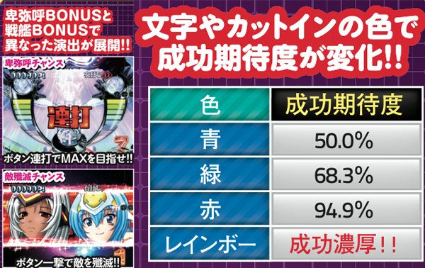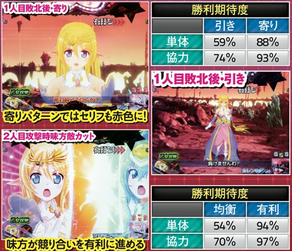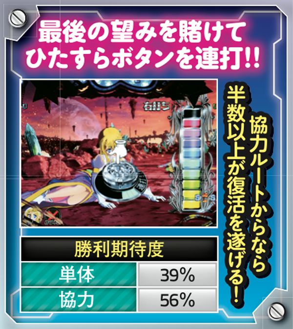 先制攻撃後は、「単体or協力」、攻撃パターンの違いが、最大の見所。自分の選んだキャラとパートナーが同時に攻撃すれば約9割が敵撃破。16R濃厚なボタンプレミアムも多数ある。