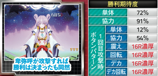 最初の一撃で勝敗が決まるケースは少ないため、本当の勝負はここから。とにかくチャンスアップの発生に期待したい。また、ロゴ振動の有無も重要で、単体で敵の反撃を受けた際、画面上のロゴが震えないと7割が敗北の大ピンチに。
